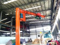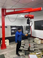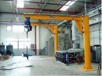 悬臂吊起重机工作强度为轻型,起重机由立柱,回转臂回转驱动装置及电动葫芦组成,立柱下端通过地脚螺栓固定在混凝土基础上,由摆线针轮减速装置来驱动悬臂回转,电动葫芦在悬臂工字钢上作左右直线运行,并起吊重物。起重机旋臂为空心型钢结构,自重轻,跨度大,起重量大,经济耐用。内置式行走机构,采用带滚动轴承的特种工程塑料走轮,摩擦力小,行走轻快;结构尺寸小,特别有利于提高吊钩行程。